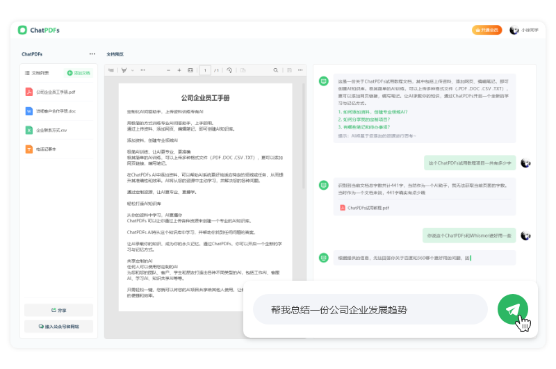 ChatPDFs是一個先進的 AI智能文檔閱讀軟件,它能夠快速幫你閱讀和理解文檔內容,可以實時解答您的任何關于文檔的問題。您只需上傳PDF文檔,即可快速開始體驗。